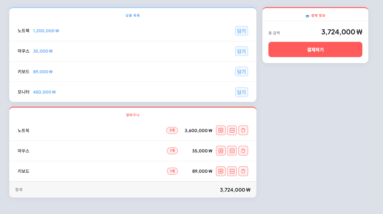 일단 prop으로 다 넘겨줘야해서, products 인 경우 useState를 이용해서 cart.jsx & products.jsx로 넘겨주고 onAdd onSub onDel 함수 또한 메인에서 만들고 다 넘겨주고 각각 모듈에서 실행하게 만들어줬습니다.