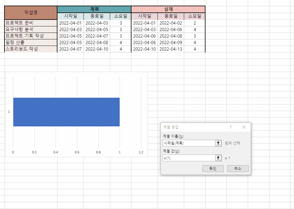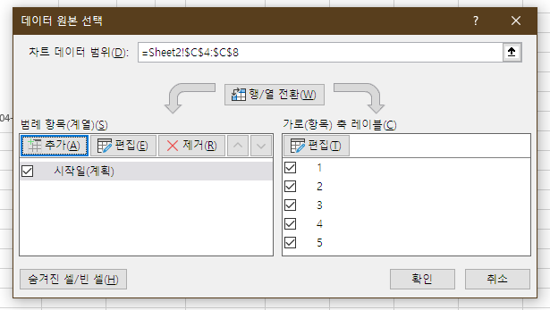 다음과 같이 계열 값 클릭하고 드래그하여 계획 열 시작일들을 가져옵니다.