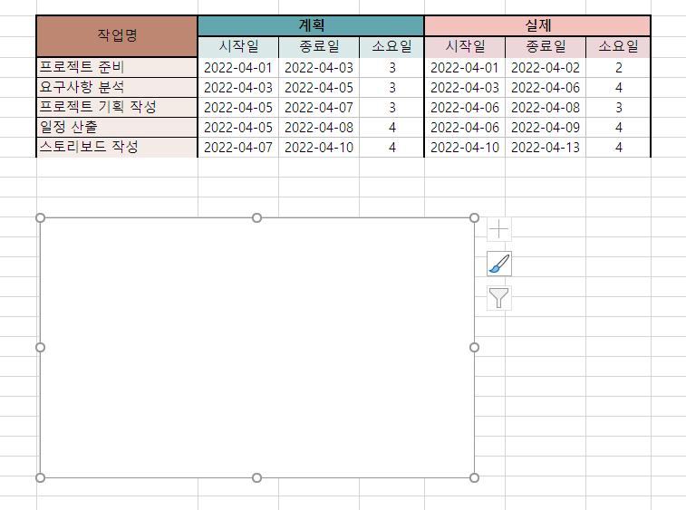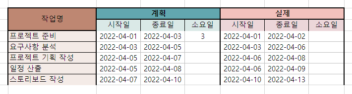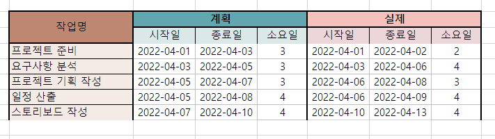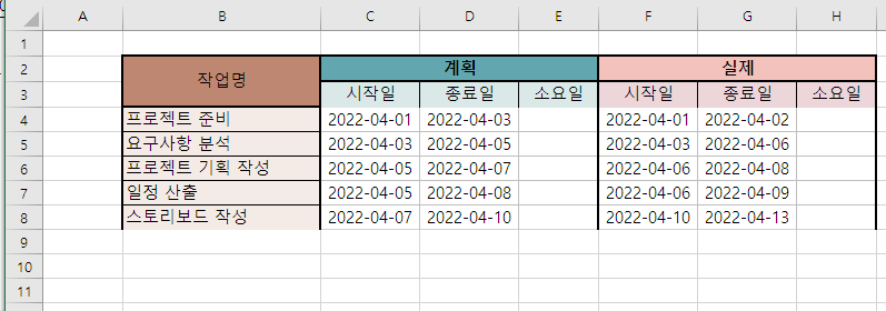 작업명을 작성하고 그 오른쪽 열에 계획, 실제 행을 만들어주고 시작일, 종료일에 데이터들을 넣고