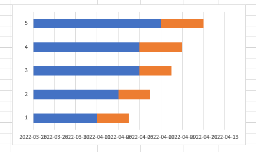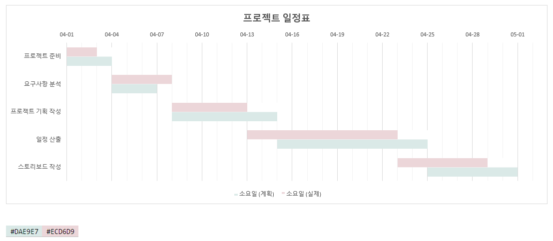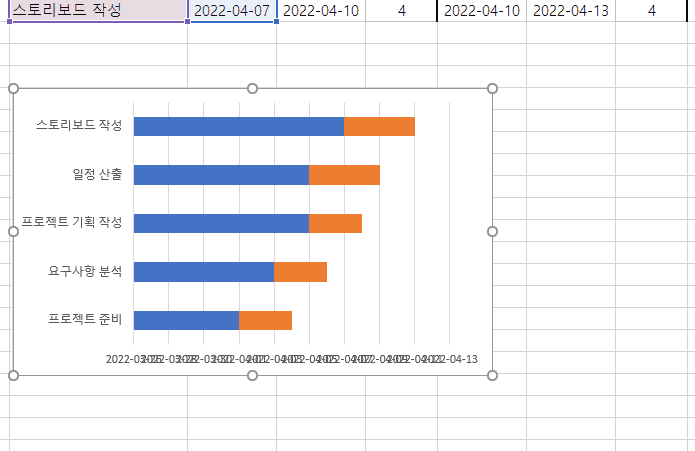 파랑색 Bar는 시작일, 주황색 Bar는 소요일이 됩니다.