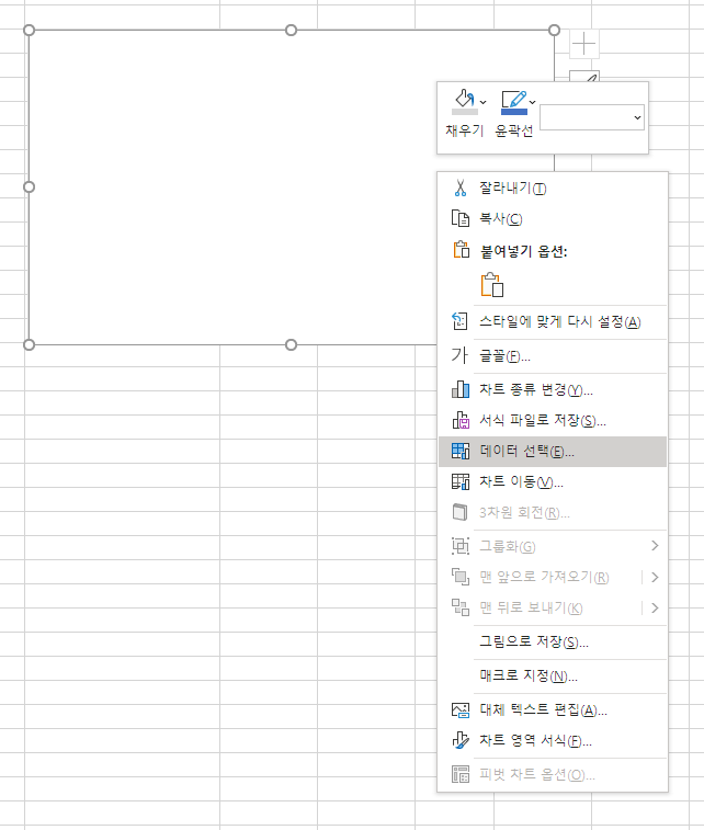 빈 차트 우클릭을 하여 데이터 선택을 눌러 줍니다.