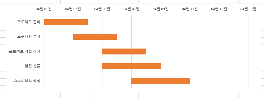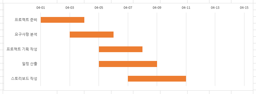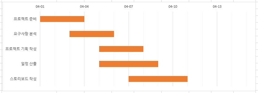 위에 있는 날짜를 클릭후 우클릭하고 축 서식 - 경계 - 최솟값을 프로젝트 시작 첫날인 4월 1일 최대값을 실제 종료일 + 2일인 4월 15일로 만들었습니다.