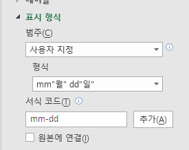 날짜 클릭 - 축 서식 - 표시 형식 - 범주 - 사용자 지정 - 형식 - mm"월"dd"일" 눌러주면 됩니다.