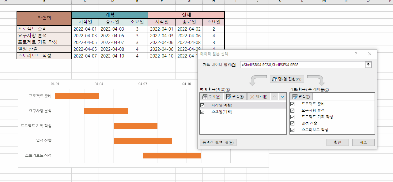 추가 - 계열 이름에 소요일(실제), 계열 값에서 화살표 눌러서 시작일 부분을 드래그 해서 확인 눌러줍니다.