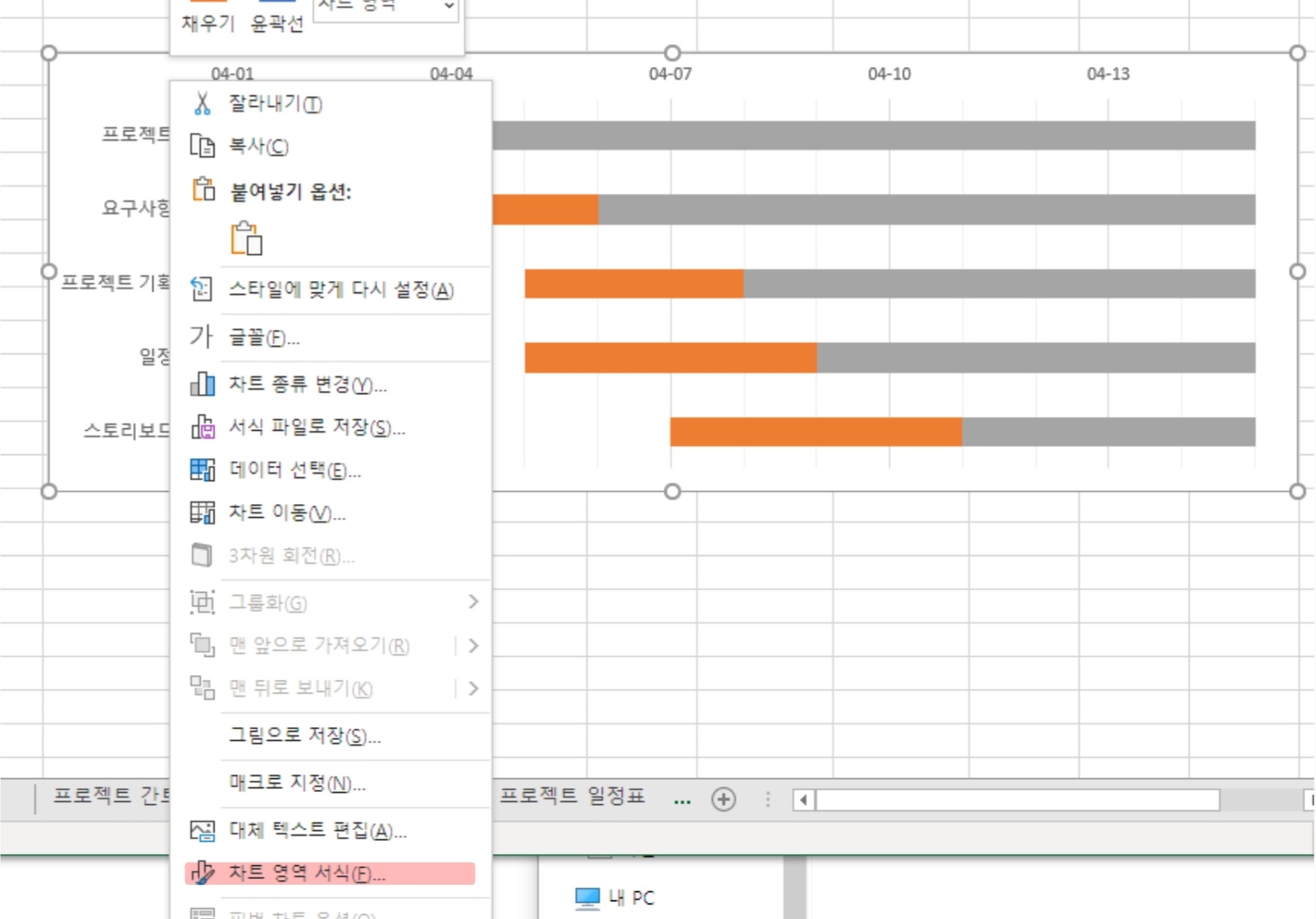 차트 누르고 우클릭하여 차트 영역 서식을 누릅니다.