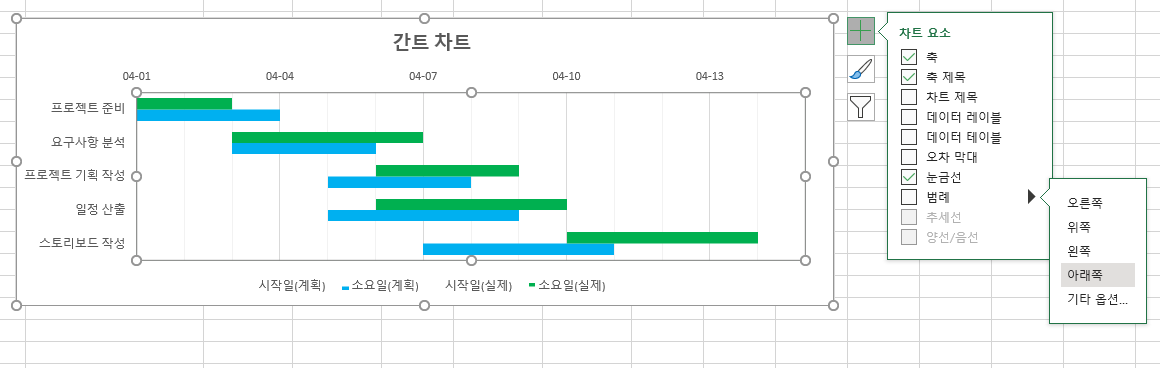 그리고 시작일(계획), 시작일(실제) 범례를 눌러서 del을 눌러서 삭제해줍니다.