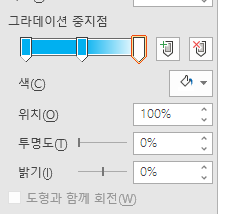 그리고 중간 지점 색상을 하얀색으로 만들어주고 위치 50% 투명도 100% 해줍니다.