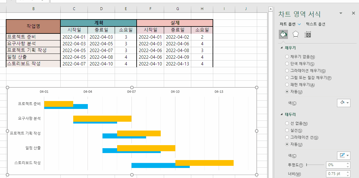 | 간트 차트 만들기 - 1 (0) | 2022.04.15 |