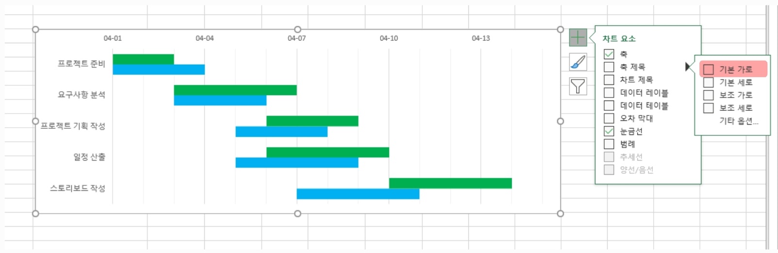 차트 클릭 후 플러스 버튼 - 차트 요소 - 축 제목 - 기본 가로 클릭
