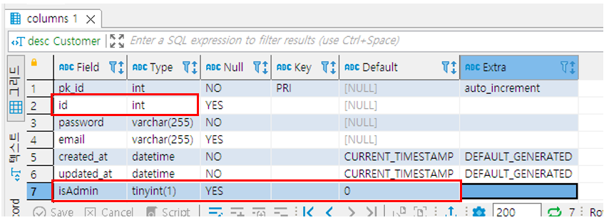 customer 테이블에 isAdmin 컬럼을 생성하며 Boolean 데이터 타입을 넣으며 기본 값을 false로 준다는 내용입니다.
