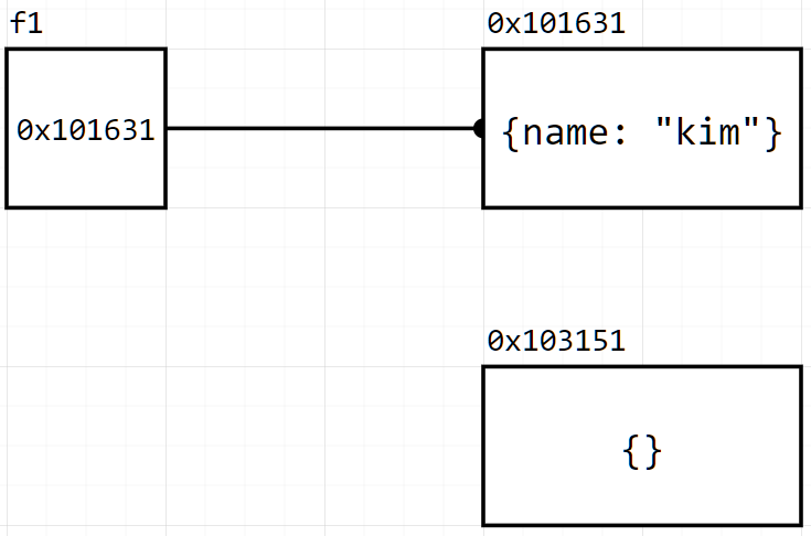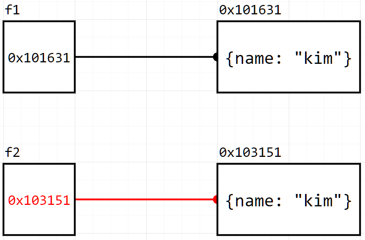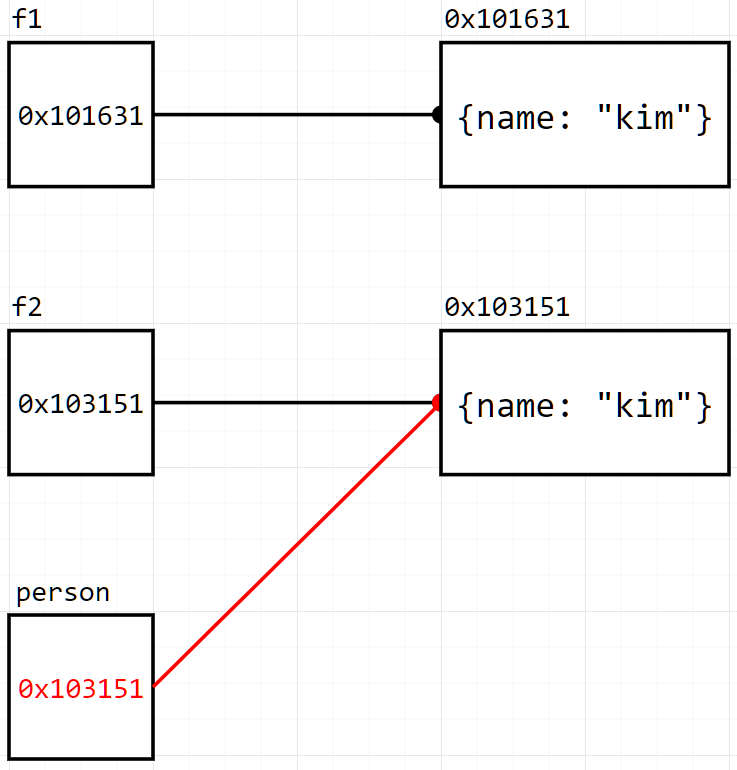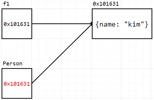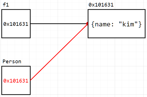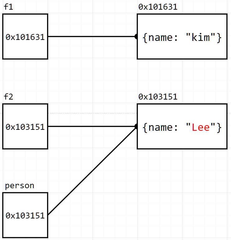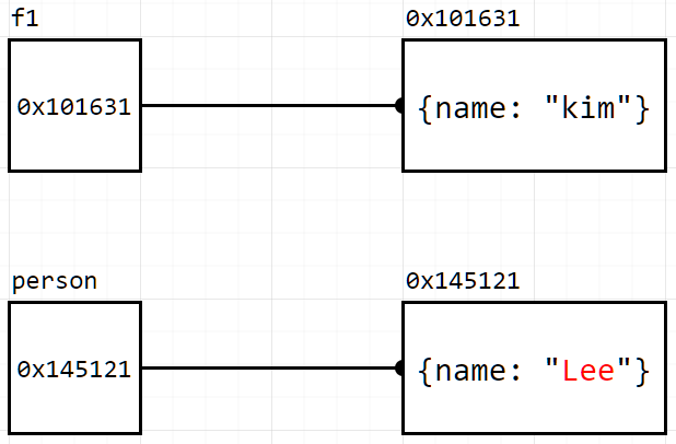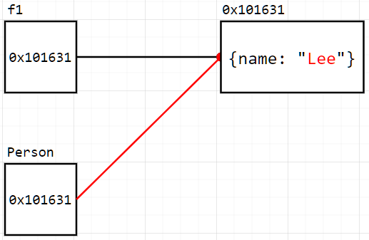 그래서 person 변수와 f1 변수가 가리키는 객체가 서로 다르기 때문에 person의 name 속성에 "Lee" 문자열을 대입시켜도 f1의 원본 객체의 값이 변하지 않습니다.