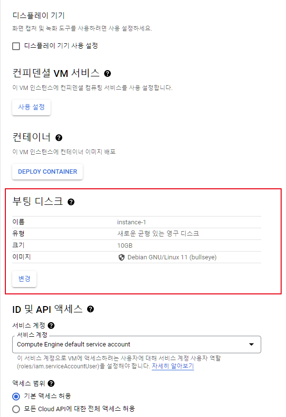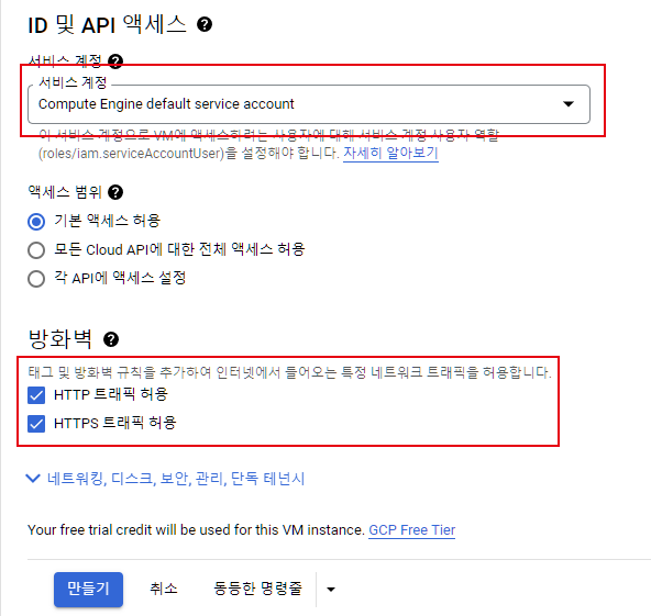 7. 부팅 디스크 밑에 ID 및 API 액서스를 확인해줍니다. 서비스 계정은 그대로 두고 방화벽 부분에 두개의 체크박스가 원래는 체크가 되어있지 않을것입니다. 체크 해줍니다.
