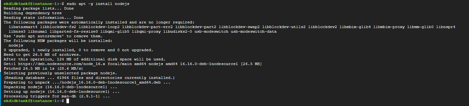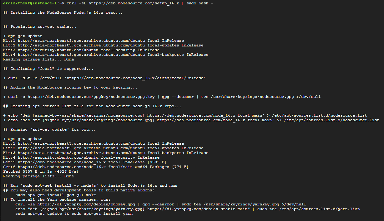 그래서 LTS 버전을 설치하기 위해선 위와 같이 curl -sL https://deb.nodesource.com/setup_16.x | sudo bash - 이렇게 명령어를 실행해 줍니다.
