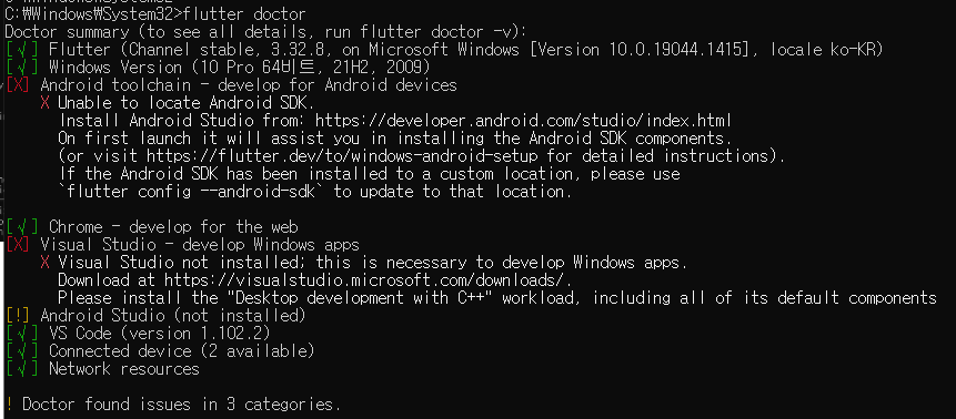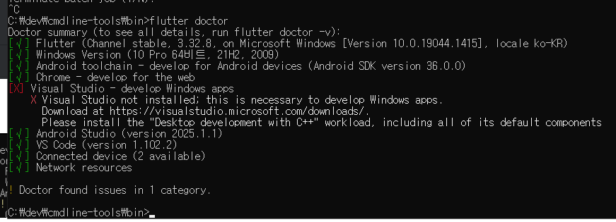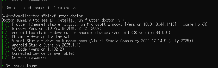 4. 환경 편집 완료 후, cmd (command) 창에서 flutter를 작성