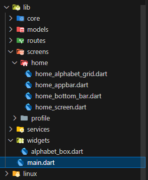 - `AlphabetBox`: 재사용 가능한 커스텀 박스 위젯, 알파벳과 배경색 주입 가능